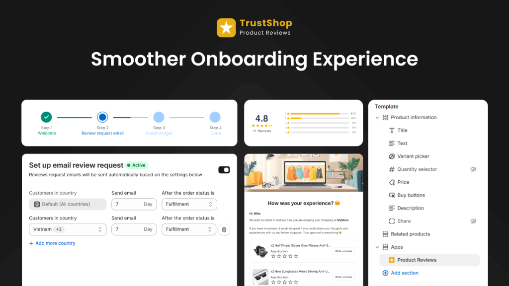 - Smoother Onboarding Experience We’ve completely revamped the onboarding process to help you reach your “Aha Moment” faster. Get up and running with TrustShop in minutes, not hours! โก