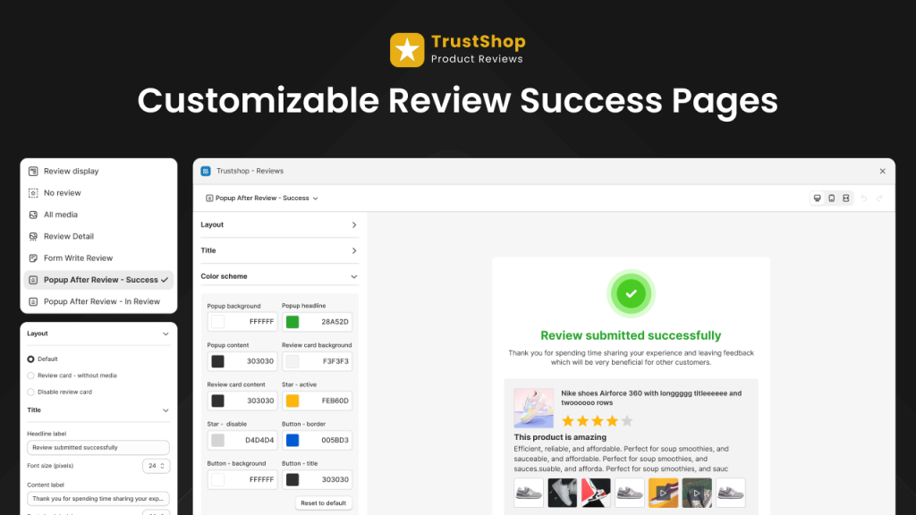 - Customizable Review Success Pages Create memorable post-review experiences! Now you can personalize the success page to match your brand and encourage further engagement. ๐จ