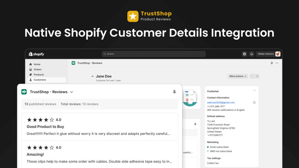 - Native Shopify Customer Details Integration Access customer reviews directly from Shopify’s customer details page. No more switching between tabs โ everything you need is right where you need it! ๐