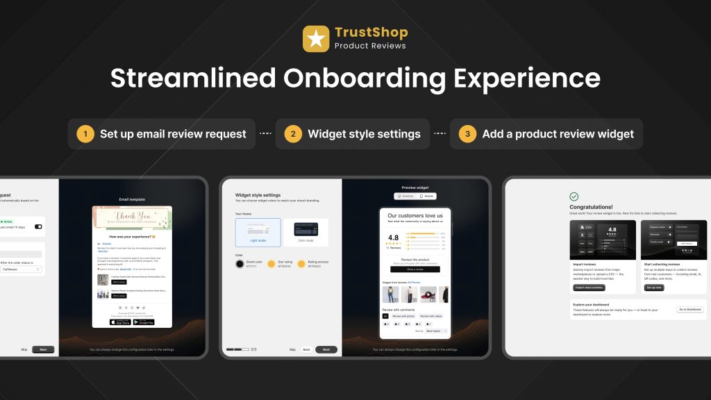 We’ve completely reimagined our onboarding process based on merchant feedback. The new flow reduces setup steps and focuses on what truly matters – getting your review system up and running quickly.