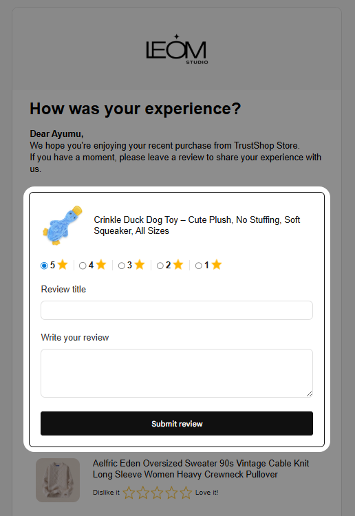 When customers open the email, they can immediately write and submit a review. By removing extra steps in the review process, In-email Forms make it easier for customers to leave reviews, resulting in higher submission rates and faster review collection.